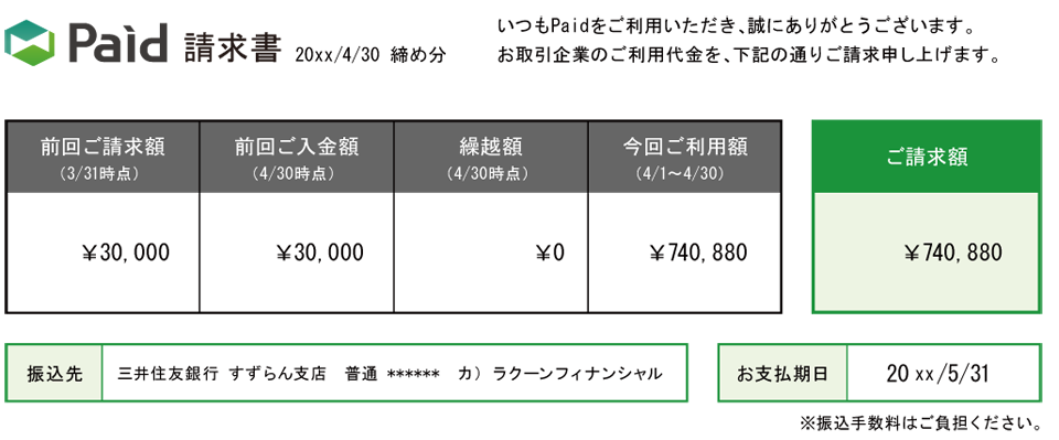 Paidから請求書が届きましたら、期日までにPaidにお支払いください。
